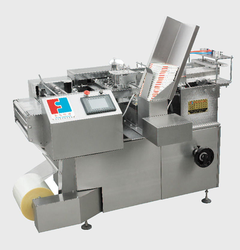 該型號包裝機包裝膜前進方向與包裝盒出料方向一致。該機主要由:包裝盒輸送裝置、包裝系統(tǒng)、透明紙供送系統(tǒng)、動力裝置、盒子輸出機構(gòu)、控制系統(tǒng)等組成。該機將包裝盒堆迭好后,由推板推動包裝盒進入包裝通道,包裝盒與透明紙在垂直通道,透明膜折疊成“冂”型包裝,經(jīng)熱封裝置使包裝盒熱封合,對包裝盒進行二次整理去皺完成包裝。電氣控制系統(tǒng)以PLC為中心,伺服控制,送膜穩(wěn)定,誤差小,可直接在觸摸屏輸入?yún)?shù)進行操作,具有人性化,操作更簡單、直觀。光纖檢測,使出現(xiàn)誤差的幾率大大減小。該機電氣控制系統(tǒng)邏輯關(guān)系嚴格,機械傳動系統(tǒng)穩(wěn)定、自動化程度高,安全保護措施齊全,性能可靠、操作、調(diào)整、維修方便。